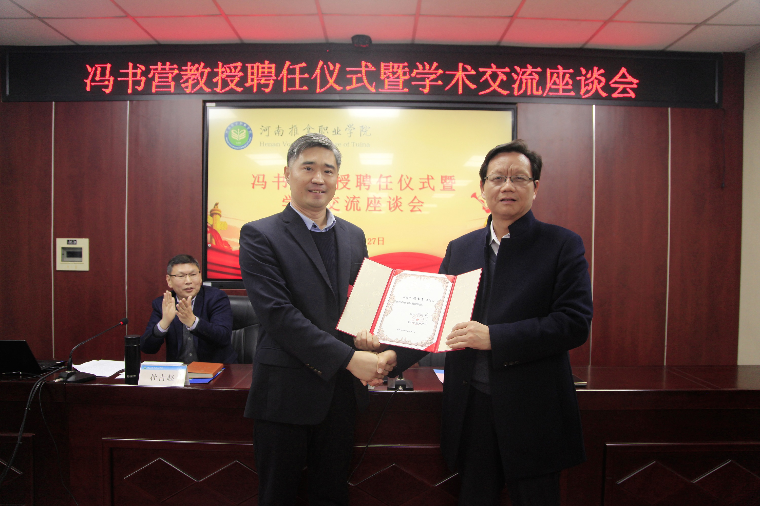 12月27日下午,我院在行政楼视频会议室举行兼职教授聘任仪式,聘任河南中医药大学教授、医学博士、博士生导师冯书营为我院兼职教授。院长陈相新出席仪式并颁发聘书,党委副书记杜占彪主持仪式。